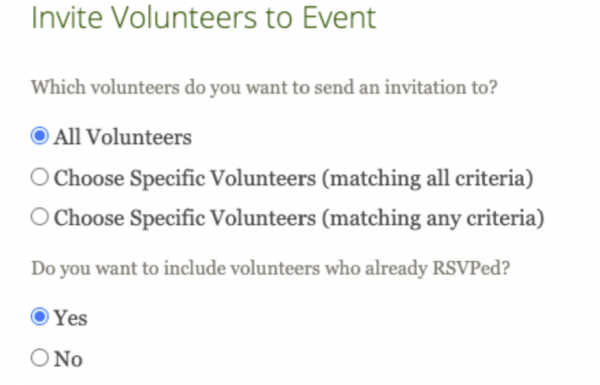 Go to your event > click Invite > under “Do you want to include volunteers who already RSVPed?” select Yes or No.