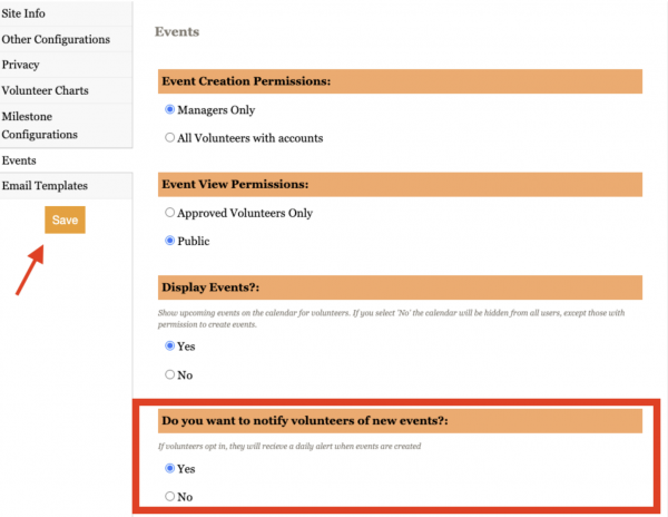You can now enable automated notifications to keep volunteers informed about new events on your calendar. If volunteers are opted into New Event Alerts, they can receive a daily alert when events are created.