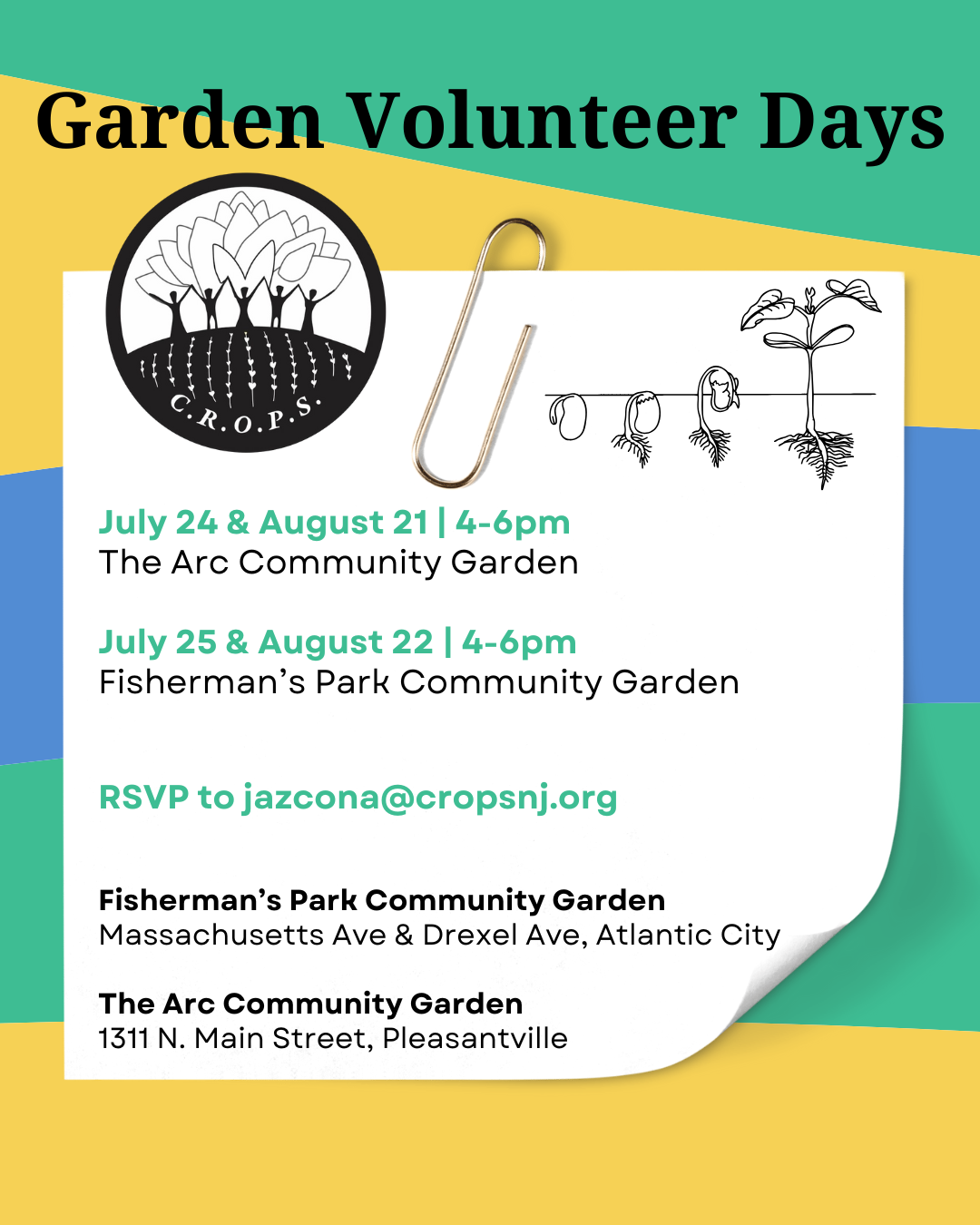 Come join C.R.O.P.S. in the Arc Community Garden, located at 1311 N. Main St., Pleasantville, NJ 08401, as we continue to plant, harvest, beautify, and enjoy some time in nature.