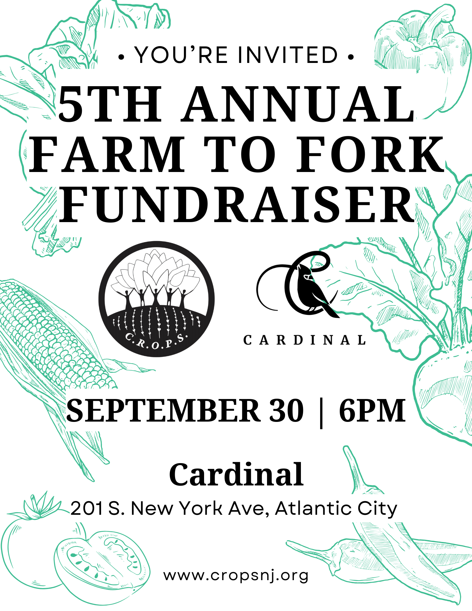 Join us as we host our 5th Annual Farm to Fork Fundraiser at Cardinal Restaurant in Atlantic City located at 201 S. New York Ave. Volunteers for this event will get to meet residents of the community, enjoy food made by chefs using produce grown right in the gardens, and see how the results of their work in assistance throughout the year in creating food security in Atlantic City.