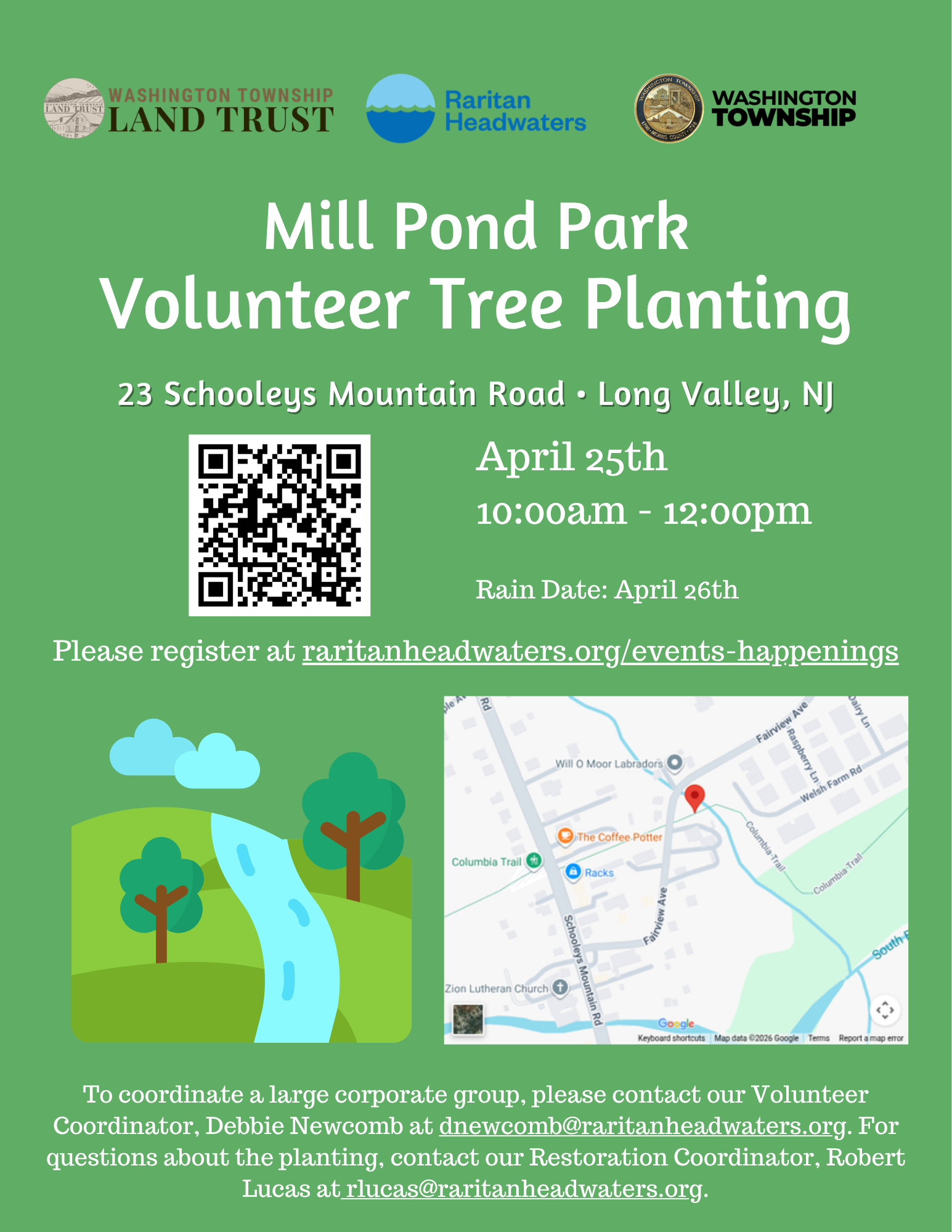 Raritan Headwaters Association has partnered with Washington Township and the Washington Township Land Trust to improve the riparian buffer along the South Branch Raritan River in Long Valley and will be planting 80 native trees and shrubs along the riverbank on April 25th from 10:00am-12:00pm. We have set a rain date for April 26th from 10:00am-12:00pm.