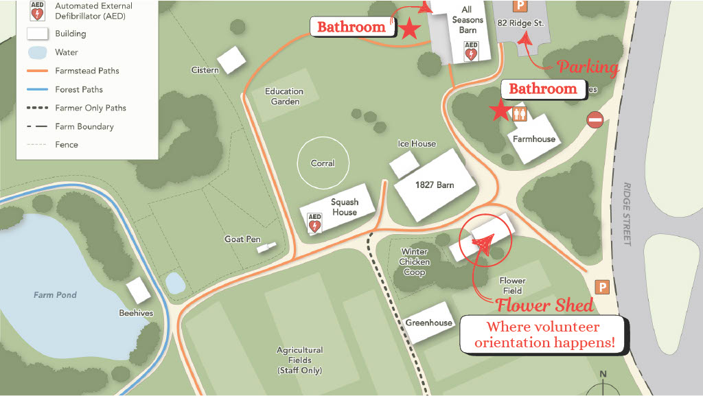 We will be meeting at the Bee Shed located between the Winter Chicken Coop and Flower Shed (old Farm Stand). The Flower Shed is where we usually meet for Orientation - so you're just going nextdoor to that. Feel free to park at the All Seasons Barn.