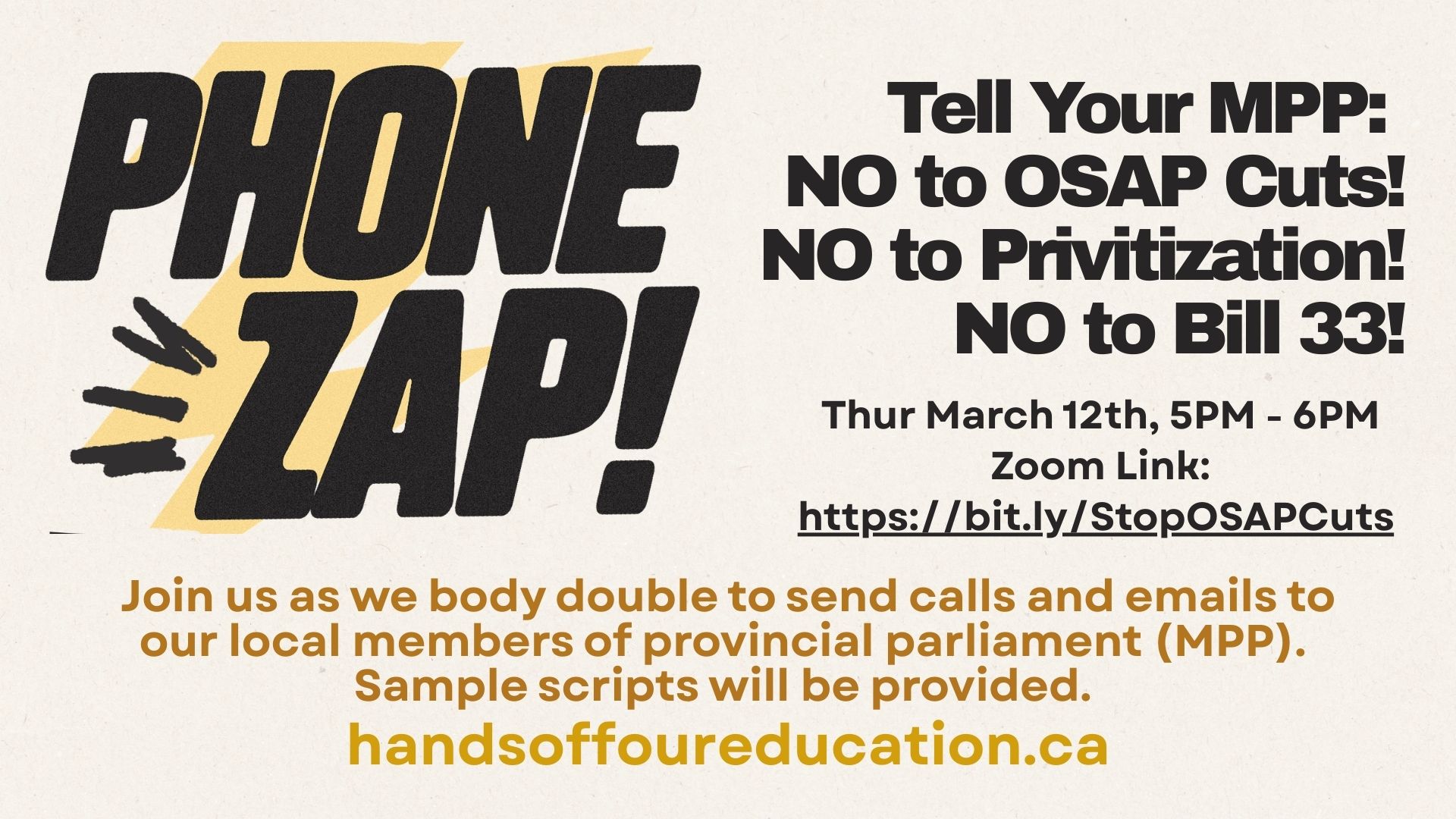 Together we will send emails & phone calls to our local members of provincial parliament (MPP) telling them NO to OSAP Cuts, NO to Tuition Hikes, NO to Privatization of Post-Secondary Education & NO to Bill 33! Sample scripts will be provided!