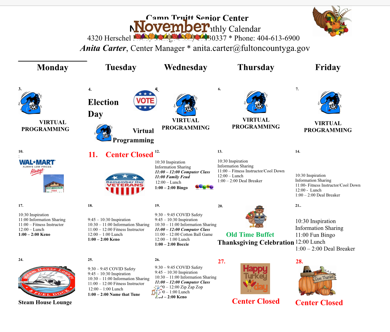 She’ll provide the volunteer application or see attached volunteer application and Camp Truitt’s November calendar.