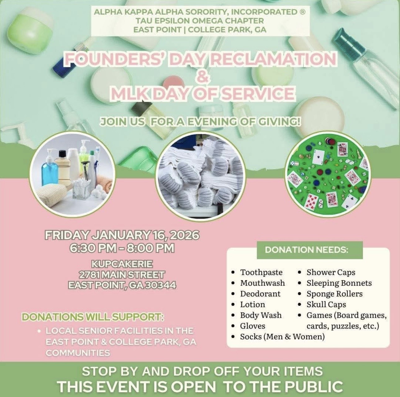 Attend and invite a Soror to Tau Epsilon Omega's Reclamation event at Kupcakerie, 2781 Main Street, East Point, GA 30344 from 6:30 p.m.-8:00 p.m., and bring donations for our local senior facilities. You will receive one (1) service hour for up to 8 items. Donation needs include: Toothpaste, Mouthwash, Deodorant, Lotion, Body Wash, Gloves, Socks (men & women), Shower Caps, Sleeping Bonnets, Sponge Rollers, Skull Caps, Games (board games, cards, puzzles, etc)