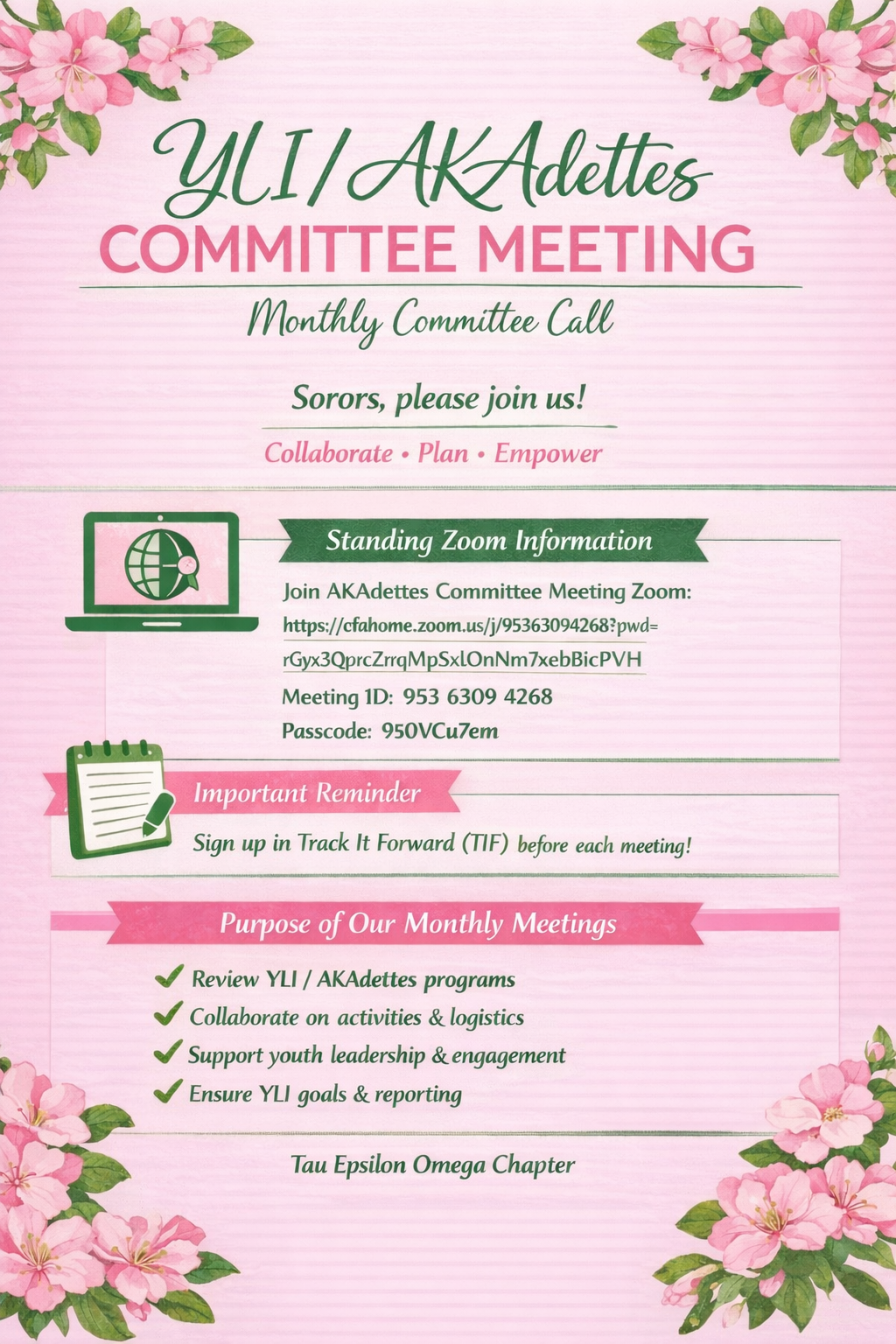 Please join us for the February 2026 YLI / AKAdettes Committee Meeting on Wednesday, February 11, 2026.